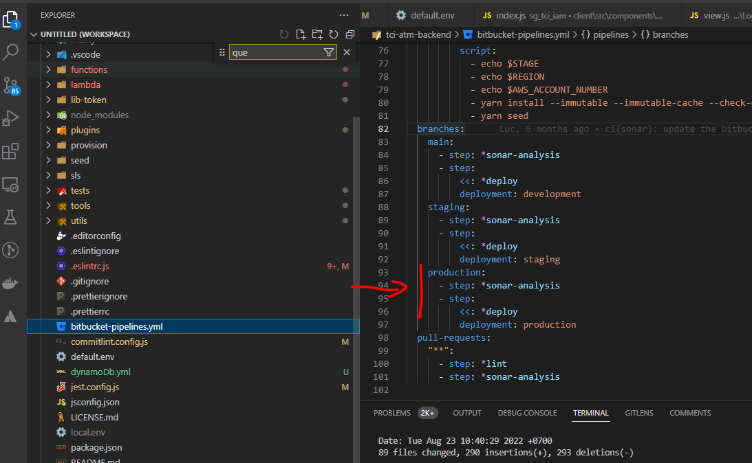 Once the Bitbucket-pipeline file is changed successfully, the User will push the source code to the Production branch to start the deployment period by following steps following: