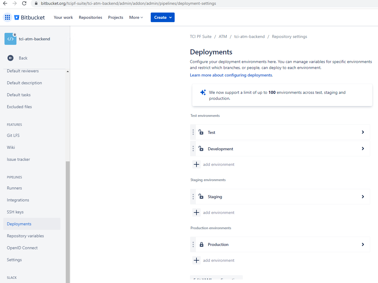 Access the link https://bitbucket.org/tcipf-suite/tci-atm-backend/src/main/ Click on The Repository Settings then select Repository variables
