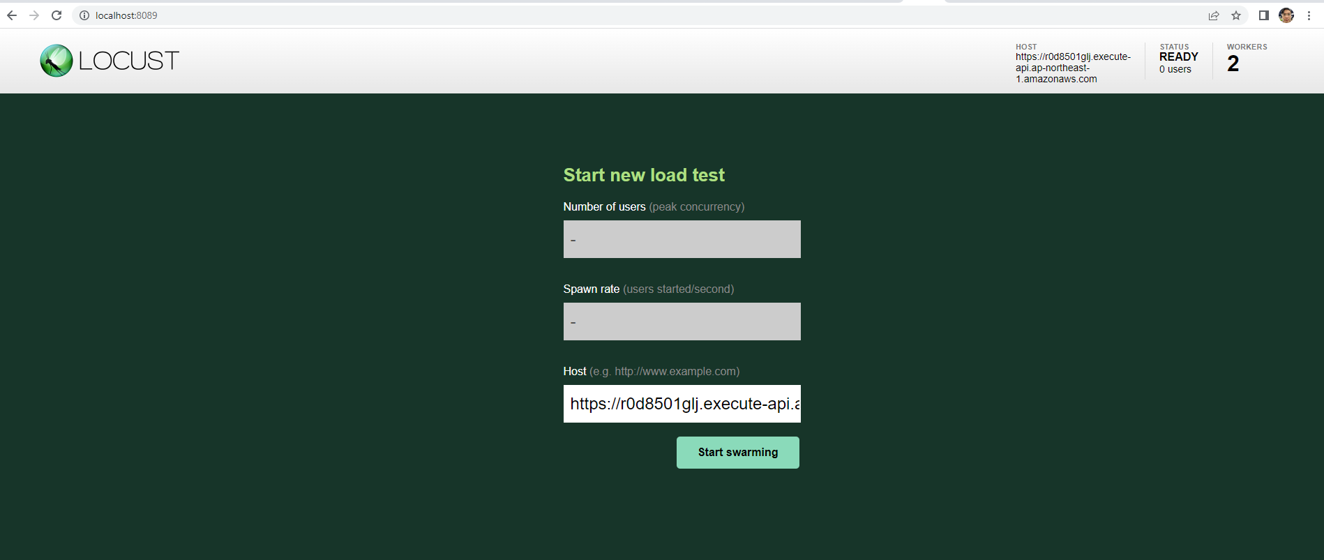 Step 5: After run 2 workers above then access Locust site to verify they statuses by pressing the Start swarming button