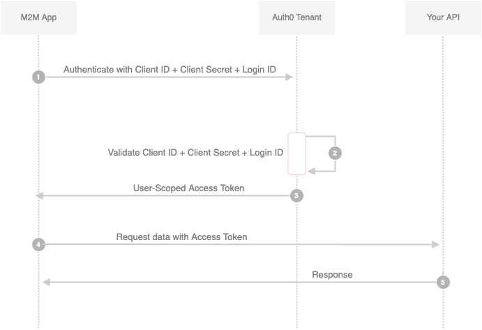 With machine-to-machine (M2M) applications, such as CLIs, daemons, or services running on your back-end, the system authenticates and authorizes the app and provide an User-scope access token. M2M apps use the User Credentials Flow, in which they pass along their Client ID, Client Secret and Login Id to authenticate themselves and get an user-scope access token.