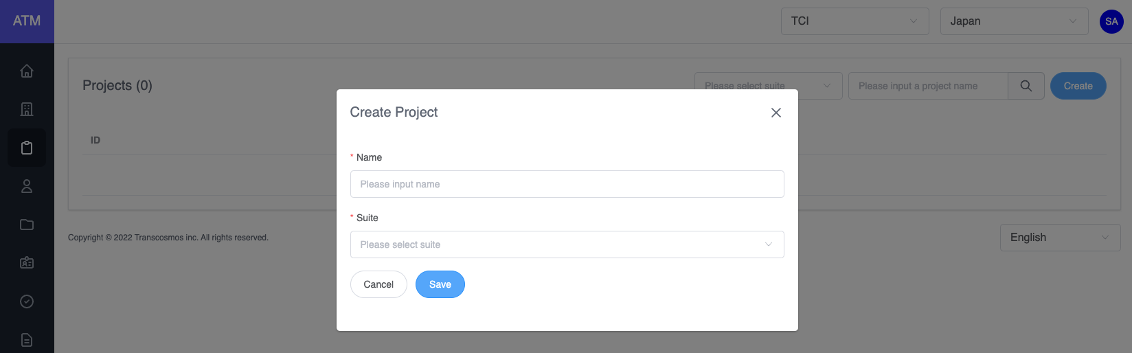 - Enter and select data: project name and suite
