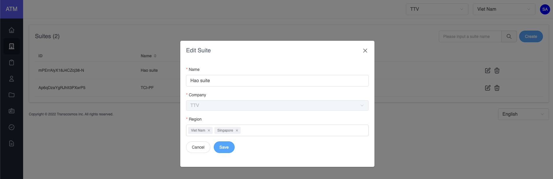 - The Edit Suite popup will be displayed, you can update the suite's name or update regions.